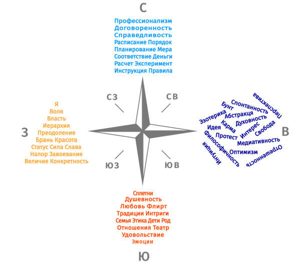 Теперь в нашем общении мы смело можем перейти на метафоры Запад, Север, Восток и Юг. И далее пользоваться ими, поскольку они уже достаточно понятны и за каждым их этих четырёх аспектов уже стоит целый набор образов и представлений.