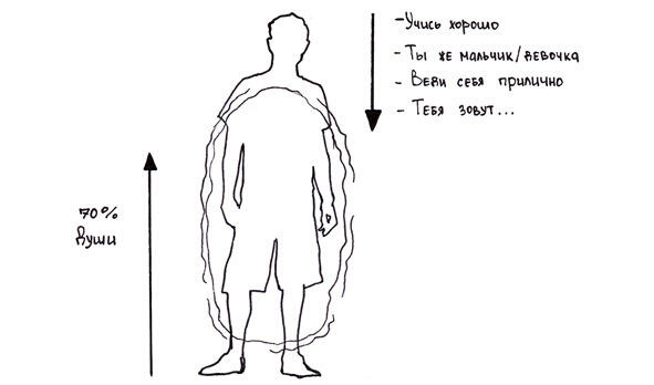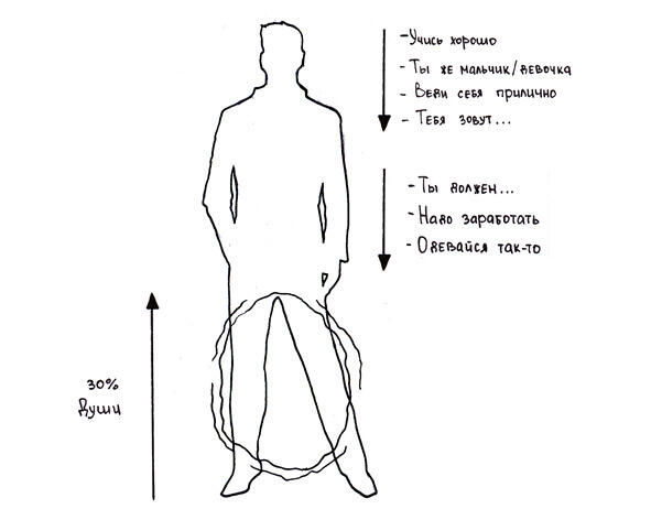 Внешний мир вносит и множество новых мыслей-убеждений. «Надо быть настоящим мужчиной/женщиной» и мы изучаем веды, обязанности мужчин и женщин. Надо зарабатывать, надо хорошо выглядеть, надо много знать, надо быть хорошим специалистом, надо есть мясо, надо тепло одеваться, надо держать вилку в левой руке. Надо, надо, надо много чего еще. Все эти мысли проникают в тело, вытесняя Душу из него. Как в законе Архимеда: «Объект, попавший в жидкость, вытесняет из емкости такой же объем этой жидкости». К каким-то годам, Души в человеке становится еще меньше на уровне половых центров.