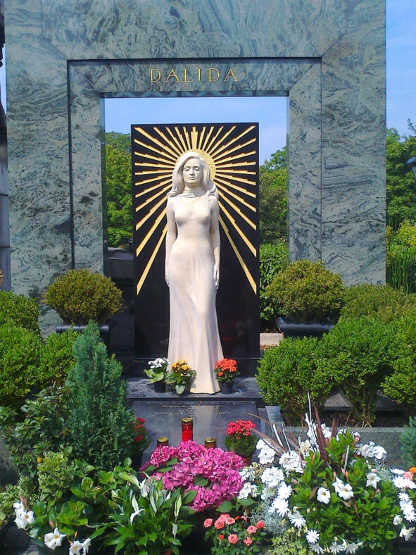 Далида похоронена на кладбище Монмартр, в трёх кварталах от своего дома. Мы с другом спустились от базилики Сакре-Кёр, прошли через площадь Тертр и ещё немного вниз и влево, в сторону кладбища, но не сразу нашли его, замешкались, пытаясь отыскать обозначение некрополя на карте.