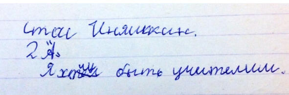 P.S. Не так давно мне написала бывшая одноклассница, которая стала учительницей в нашей школе. Разбирая шкафы в классе, она нашла небольшую коробку, куда мы складывали записки, кем хотели быть (знаю, что звучит нереально, сам бы не поверил). Она прислала фото моей записки. На ней было написано: «Стас Иняшкин. 2 А. Я хочу быть учителим». Мне было 7 лет. Судьба? (Я до того момента был уверен, что в детстве мечтал стать зубным врачом.)
