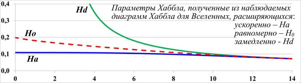 Рис.11.4. Наблюдаемые параметры Хаббла в трёх разных Вселенных.