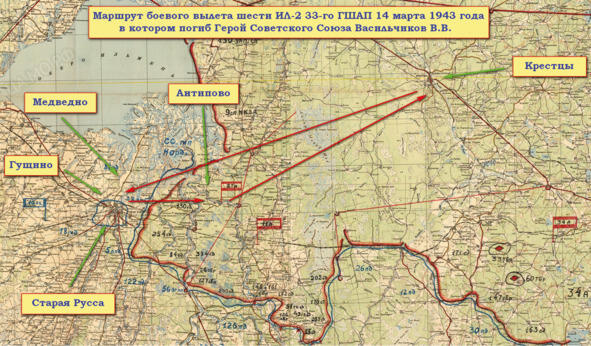 Ситуационная схема боевого вылета Ил-2 14 марта 1943 года в районе Старой Русы на карте