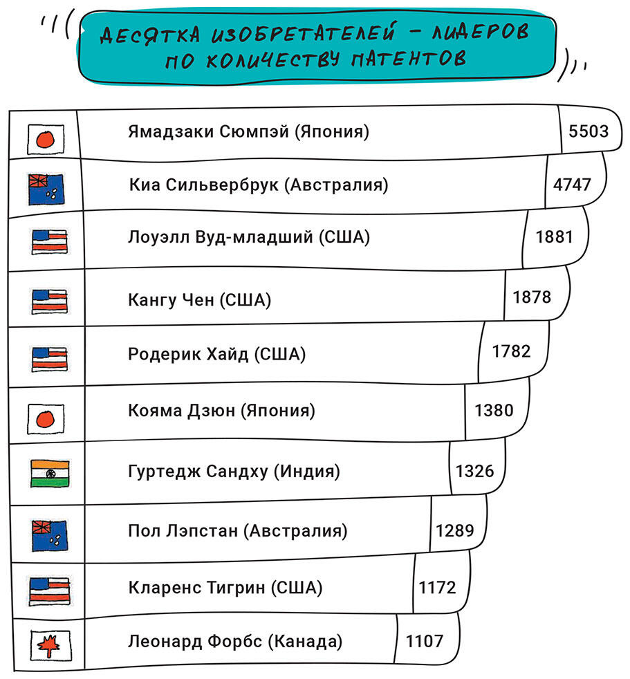 Например, у знаменитого изобретателя Томаса Эдисона было 1093 (!) патента на самые разные устройства: лампочки накаливания и телеграфы, кинокамеры и машинки для подсчета наличных, батарейки и радиометры. Эдисон удерживал мировой рекорд по количеству патентов много лет.