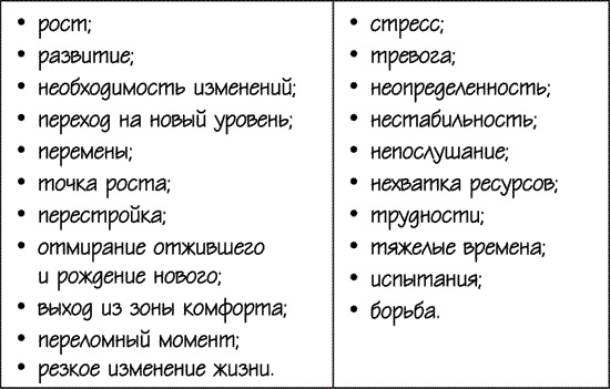 С левой стороны я расположила ассоциации с нейтральным или позитивным смыслом, с правой негативные. Обратите внимание, количество и тех и других примерно одинаково. В этом вся суть кризиса: местами это может быть неприятно, но совершенно необходимо и открывает новые возможности. Кстати, в японском языке слово «кризис» состоит из двух иероглифов: «разрушение» и «шанс», то есть разрушение дает нам новый шанс.