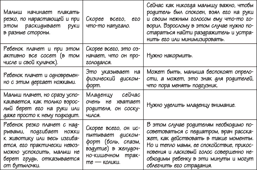 * * *В начале, если малыш часто плачет, родителям может казаться, что они что-то делают не так. Но со временем взрослые учатся достаточно быстро определять, что именно сейчас хочет сказать их ребенок. Поделюсь своими наблюдениями.