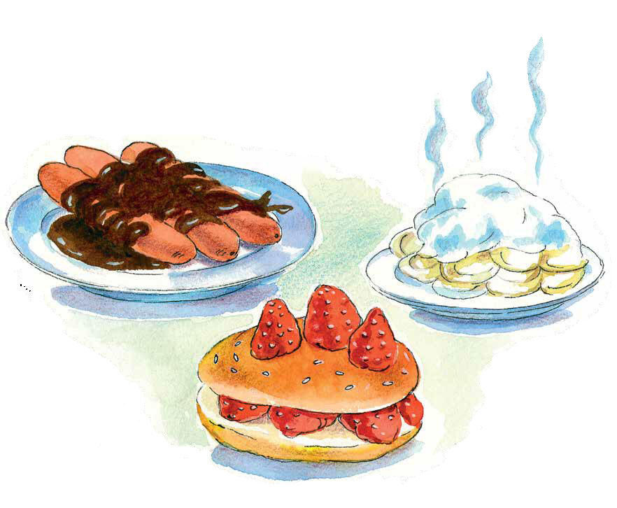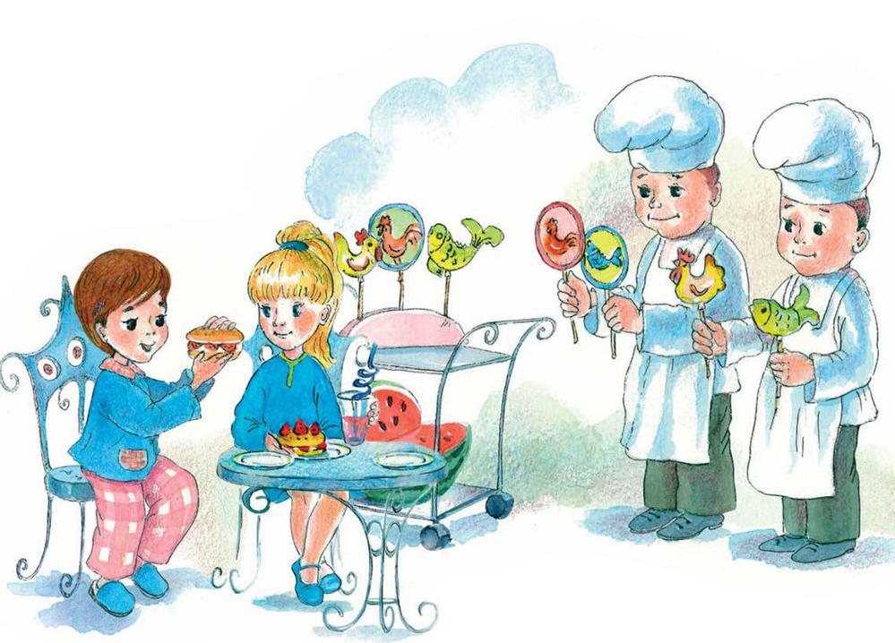 Продавщица ничуть не удивилась и позвонила в пряничный колокольчик. Тут же примчалась огромная кастрюля на колёсах. Из неё выпрыгнули повар в ожерелье из сосисок и десять поварят в колпаках из мороженого. Заказ был принят!