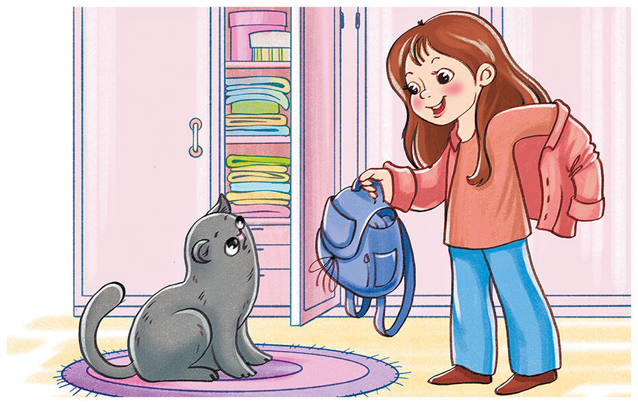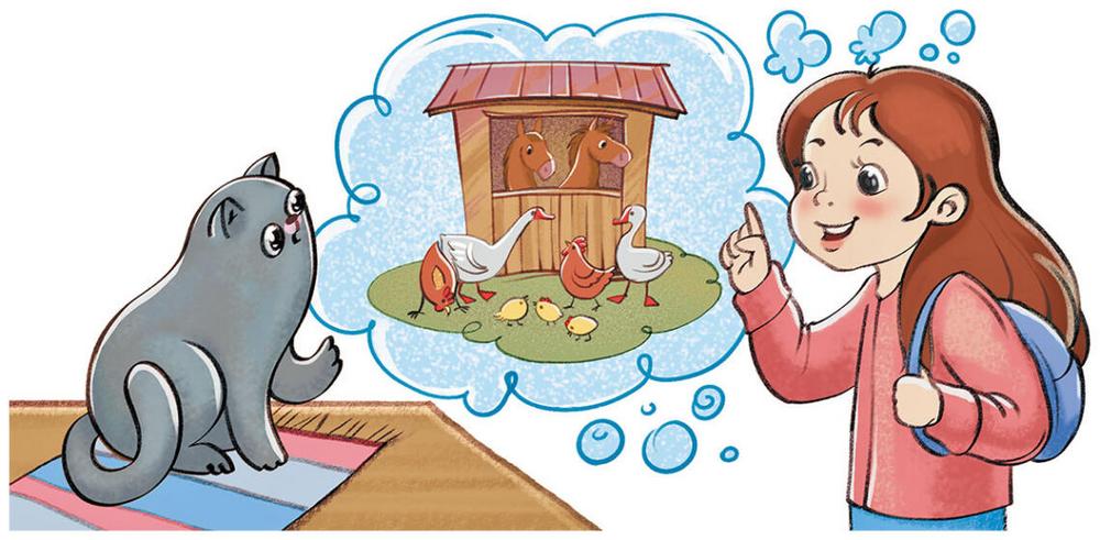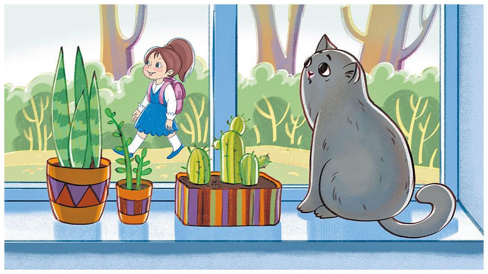 Кисель очень любит разговаривать с Дуней. Как-то он даже рассказал ей все кошачьи секреты! А Дуня рассказала ему о том, что любят или не любят делать люди. Но в последнее время эти душевные разговоры стали происходить всё реже ведь Дуне исполнилось семь лет, и она пошла в школу. У неё совсем не было времени сидеть с Киселём и болтать: с самого утра она ехала на уроки.