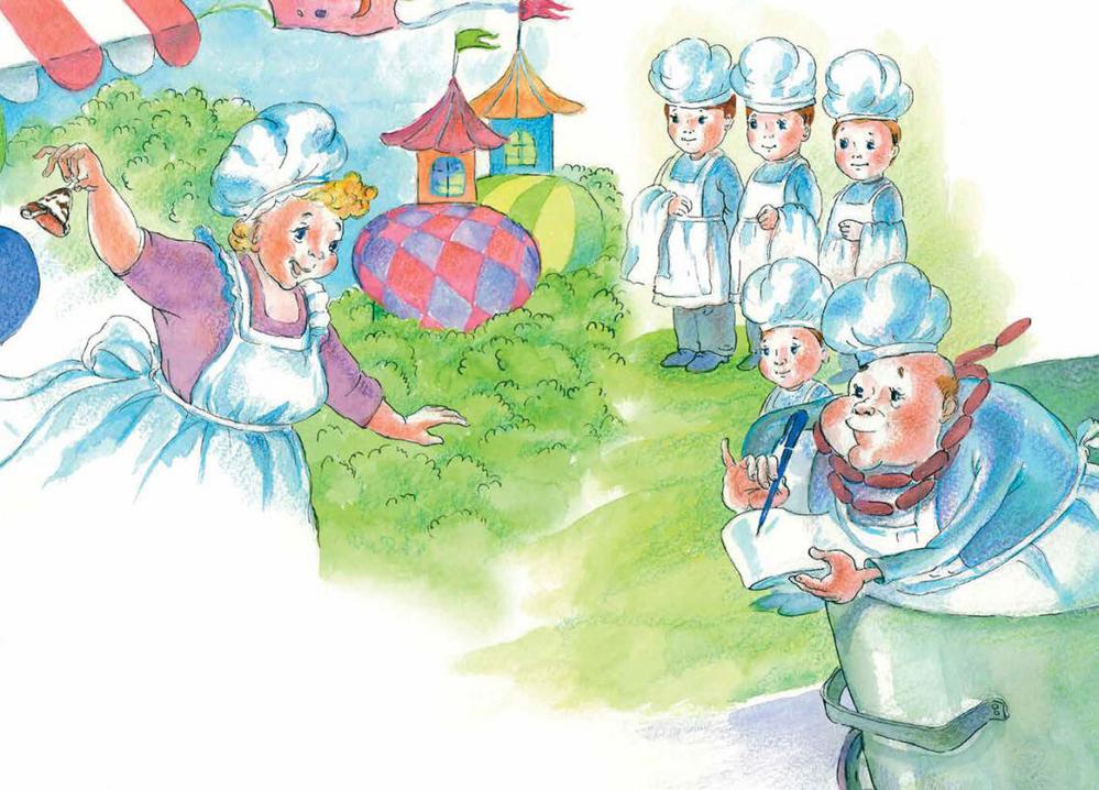 Сатушы түк те таң қалмастан тәтті нан-нан жасалған қоңырауды қақты. Сол-ақ екен, ортаға дөңгелектері бар үлкен қазан келе қалды. Қазанның ішінен шұжықтан алқа таққан аспазшы мен балмұздақтан жасалған қалпағы бар он көмекші атып шықты. Тапсырыс қабылданды.