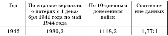 Во-вторых, сведения об убыли немецких солдат (погибших, умерших, раненых и пропавших без вести[7]) в 10-дневных донесениях войск существенно меньше, чем такого же рода сведения в обобщенных справках служб учета потерь вермахта. Так, бывший офицер вермахта Вернер Хаупт в книге, посвященной Московской битве, приводит сведения из справки вермахта от 10 января 1942 года о потерях группы армий «Центр», начиная с 3 октября 1941 года. Эти сведения, приведенные в табл. 1.2, в 1,51,7 раза выше, чем в 10-дневных донесениях войск. Аналогичная ситуация с информацией об общей убыли вермахта в 1942 году (табл. 1.3) сведения 10-дневных донесений меньше в 1,77 раза соответствующих сведений за 1942 год, представленных в справке вермахта об убыли с 1 декабря 1941 года по май 1944 года.