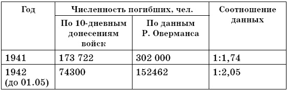 В-пятых, сведения о погибших немецких солдатах в 10-дневных донесениях войск кардинально отличаются от цифр, полученных современным немецким исследователем потерь вермахта Рюдигером Овермансом. Различие в численности погибших немецких солдат на советско-германском фронте по данным 10-дневных донесений и по расчетам Р. Оверманса[8] в периоды войны, когда происходила Московская битва, приведены в табл. 1.6