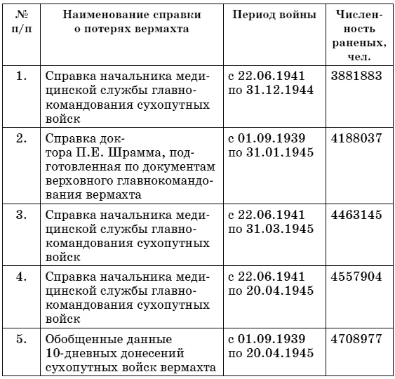 В-восьмых, следует иметь в виду, что содержание категории «раненые» в 10-дневных донесениях немецких войск не совпадает с содержанием такого же понятия в донесениях советских войск. О численности раненых за период с 01.09.1939 по 31.01.1945 доктор П. Е. Шрамм писал в предисловии к Приложению к дневнику военных действий Верховного главнокомандования вермахта: «В отношении раненых следует иметь в виду, что здесь дело идет лишь о лицах, проходивших курс лечения в стационарах», т. е. учтены лишь раненые, включаемые в категорию «убыль». Сведения табл. 1.7 показывают, что численности раненых, приведенные в различных других справках вермахта, в том числе и в 10-дневных донесениях армий и других объединений сухопутных войск вермахта, включают не всех раненых, а только направленных в тыловые госпитали.