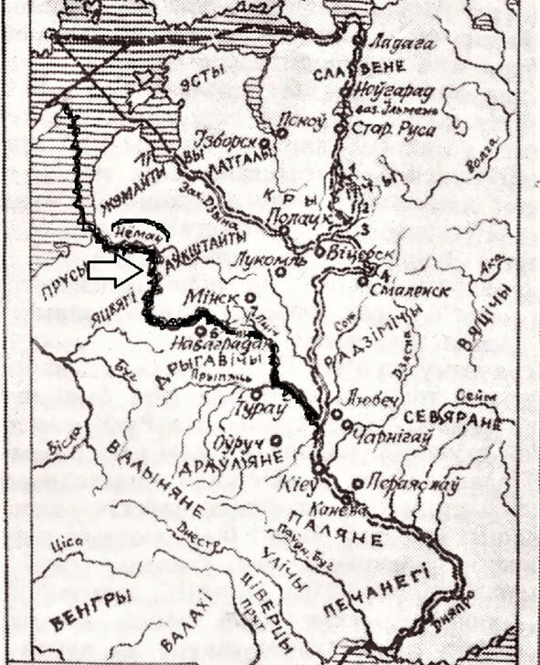 Шлях з «Варагаў у грэкі» па Нёмне. Малюнак В. Сташчанюка. Кісялёў У. М. Пуцявінамі Наднямоньня. Мн.: Полымя, 1994. Стар.113