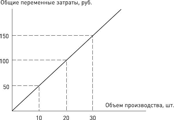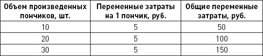 Если объем увеличивается на 10 %, то переменные затраты также возрастают на 10 %. Например, если производство пончиков ЗАО «Пончик» выросло на 5 %, то логично предположить, что и затраты на ингредиенты для изготовления пончиков тоже выросли на 5 % (исходя из сохранения закупочных цен на прежнем уровне).