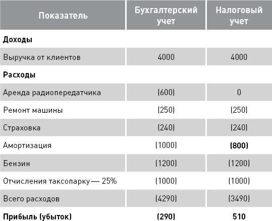 ПРИМЕР 16Бухгалтерский и налоговый учетИспользуем данные о прибыли бизнеса из примера 15. Допустим, что согласно Налоговому кодексу РФ аренда радиопередатчика в целях исчисления налога на прибыль не может быть включена в расходы, а износ автомобиля для целей налогообложения в первый год равен не 1000, а 800 евро. Тогда мы получим следующие данные: