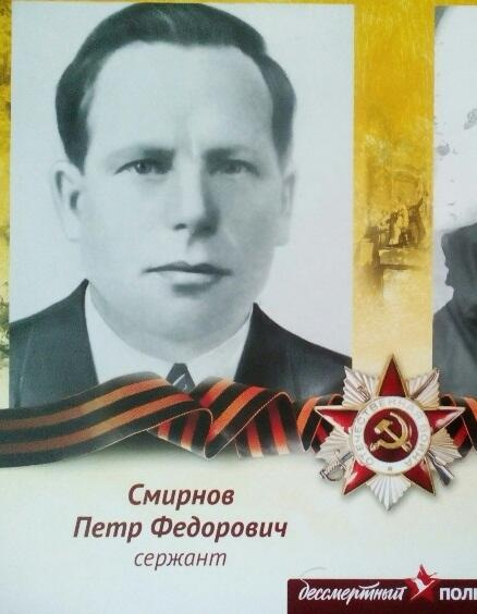 Меня зовут Тамара Зыкова, и я хочу Вам рассказать про своего прадедушку Смирнова Петра Федоровича. Мой прадедушка родился в 1901 году, в Ярославской области. Точная дата нам неизвестна. Он женился на моей прабабушке. Ее звали Манефа и они стали жить в поселке Талица, Буйского района, Костромской области. Это небольшой поселок. Там до сих пор сейчас живут моя бабушка и мой дедушка.