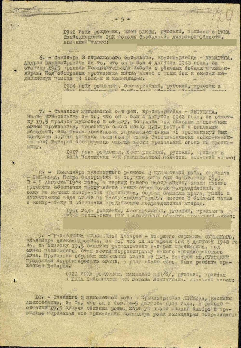 В мае 2009 года мы получили этот документ, и в нем написано, что «Командира пулеметного расчета 2 пулеметной роты, сержанта Смирнова, Петра Федоровича за то, что он в бою за отметку 19,5, 3-5 Августа 1943 года, в период нашего наступления, огнем своего пулемета обеспечил наступление наших стрелковых подразделений. В одну из ночных контр-атак противника, сорвал замыслы врага, умело и мужественно, ведя огонь по наступающему врагу. Вместе с бойцами пошел в контр-атаку и обеспечил продвижение подразделения вперед». (Орфография и пунктуация сохранены, текст в оригинале на фото).