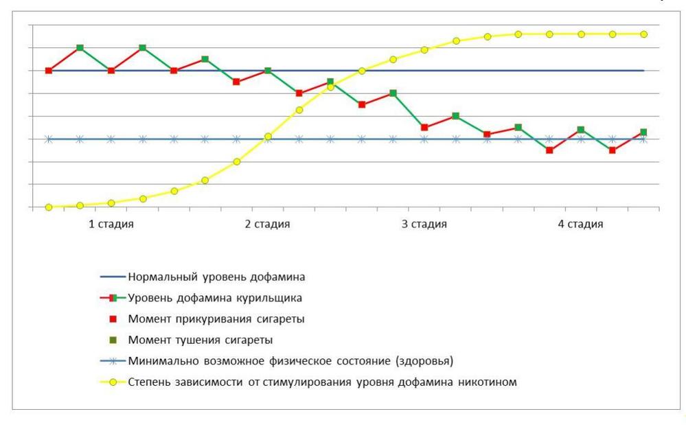 4 стадия существенная зависимость выработки дофамина от наличия никотина в крови при значительном ухудшении здоровья, когда вдыхание дыма от тлеющих сигарет уже не повышает уровень дофамина до его приемлемого для психики уровня. Основной признак этой стадии: хочется вдыхать дым от тлеющих сигарет еще и еще, но уже физическое состояние ограничивает потребление никотина, т. к. организм переполнен ядами.