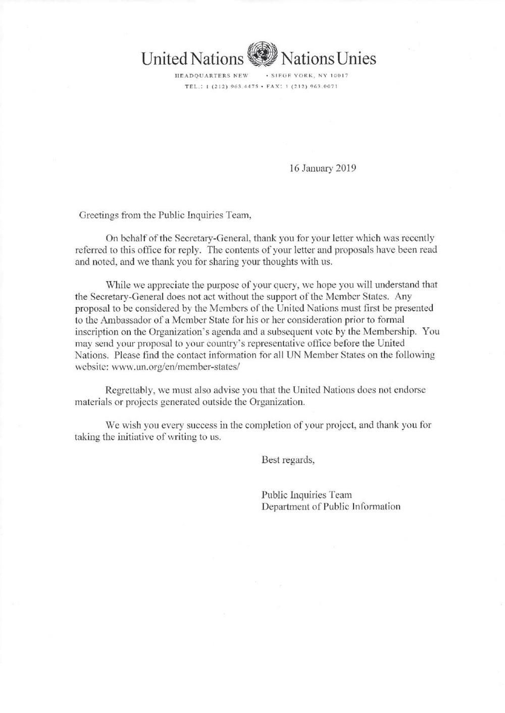 Высоко оценивая цели Вашего обращения, мы одновременно рассчитываем на Ваше понимание того, что Генеральный секретарь не может предпринимать те или иные действия без поддержки государств-членов ООН. Любое предложение, выносимое на рассмотрение членов Организации Объединённых Наций, должно быть сначала представлено Постоянному Представителю одной из стран-членов для его рассмотрения и только потом может быть официально внесено в повестку дня Организации и впоследствии вынесено на голосование странчленов ООН. Вы можете отправить предложение в Постоянное Представительство Вашей страны при Организации Объединённых Наций. Вы можете найти контактную информацию по всем государствам-членам ООН на следующем веб-сайте: www.un.org/member-states/