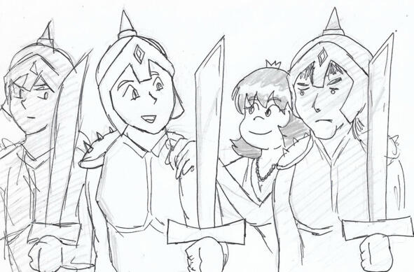Выйдя на плац перед дворцом, где уже выстроился почётный караул, Сэли пошла вдоль ровной шеренги солдат, облачённых в золотые доспехи, обходя их позади. Наконец, обнаружив искомого индивида, она остановилась и постучала его по шлему, который издал звонкий звук.
