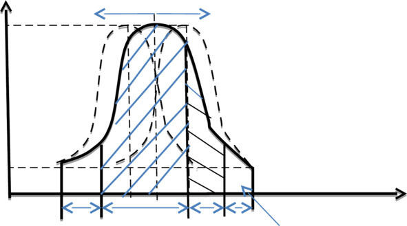 Одной из объективных моделей отражающей динамику общественного сознания, является закон нормального распределения Гаусса (Рис.4). Для наглядности использования модели примем в качестве значений параметров, по оси Х типы строя психики (ТСП), по оси Y- общее количество людей (общество). Нами выбраны типы строя психики [2], поскольку они достаточно чётко и объективно отражают уровень сознания. По мере перехода от одного уровня психики к другому изменяется и сознание индивидуума. Условно можно принять, что структура общества по параметру, как уровень сознания, подчиняется закону нормального распределения. Однако, исходя из качественного состояния характеризующего тип строя психики, количественные показатели будут заметно отличаться. На графике мы это отметили разницей заштрихованных площадей.