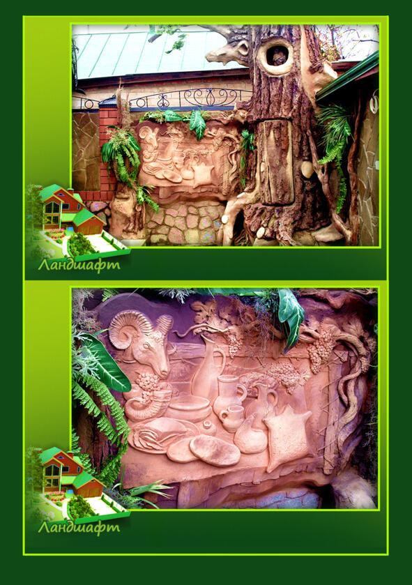 Тематический барельеф у мангала и ствола дерева/внутри винная ёмкость/.