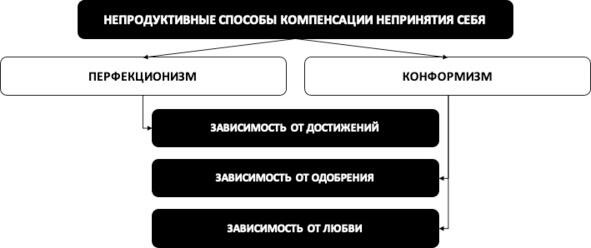 Непринятие себя глубоко укоренившаяся убеждённость человека в собственной плохости, никчёмности, непривлекательности или дефективности как личности в целом. При наличии такого внутреннего негативного образа самого себя, или негативной я-концепции, человек положительно оценивает себя только при наличии внешних факторов достижений, одобрения окружающих, романтических отношений и т. д. Иными словами, вы требуете от себя идеального выполнения максимального количества дел, стремитесь быть хорошим и удобным для других людей, явно или скрыто требуете одобрения от окружающих и вечной любви от партнёра, чтобы не сталкиваться со своим внутренним негативным образом и доказать себе и другим, что вы хороший, успешный, привлекательный и полноценный. В этой связи наиболее частыми непродуктивными способами компенсации негативных глубинных убеждений человека о себе являются перфекционизм (стремление быть лучшим и идеальным), порождающий зависимость от достижений, а также конформизм (стремление быть хорошим и удобным), создающий зависимости от одобрения и/или от любви.