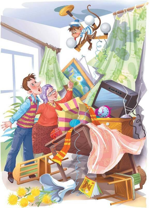 И точно: все табуретки, все столы и даже телевизор всё в квартире вверх ногами поставлено. А на люстре обезьянка висит и электрические лампочки облизывает.