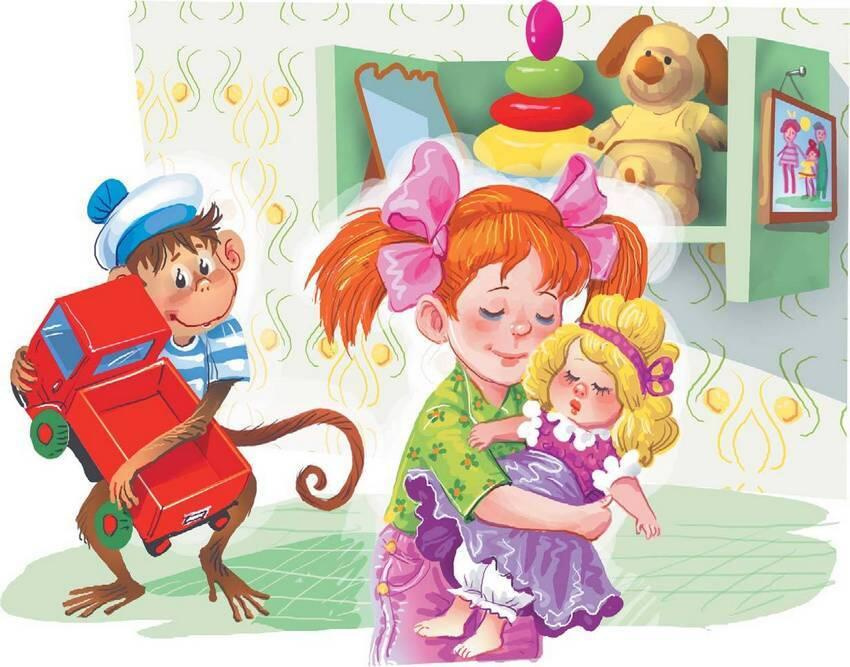 Бабушка в комнату заглянула. Видит Вера ходит, большую куклу Лялю укачивает. А за ней по пятам Анфиса ходит и большой грузовик качает.