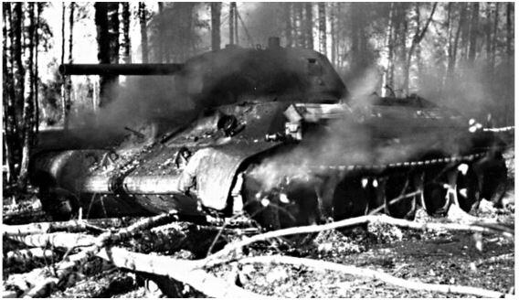 Подбитый и сгоревший в лесу танк Т-34. Лето 1941 г.