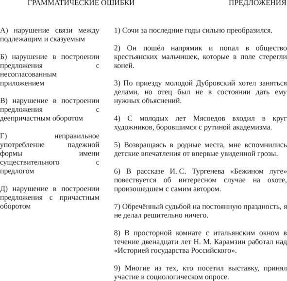 Задание установить соответствие между предложением с грамматической ошибкой и определением этой ошибки (или её названием).
