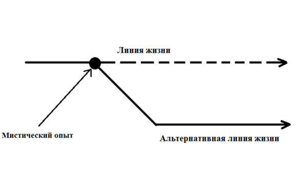 Представим себе индивида и его линию жизни, он спокойно живет, как вдруг на одном этапе линии жизни он переживает мистический опыт и это приводит тому, что человек полностью меняется. Трансформируется его мировоззрение, его взгляды, увлечения, в том числе его положение в обществе. Образуется как бы альтернативная линия жизни. Многое зависит на каком этапе произошел мистический опыт, в детском или во взрослом возрасте. Особенность детского возраста заключатся в том, что помимо трансцендентного опыта, влияние могут оказать близкие родственники, например родители, которые уже пережили свой мистический опыт и передают его своему ребенку. В этом случае важен опыт и мировоззрение самих родителей именно от них зависит особенности миропонимания маленького человека, когда он вырастет и какое мировоззрение у него сложится.