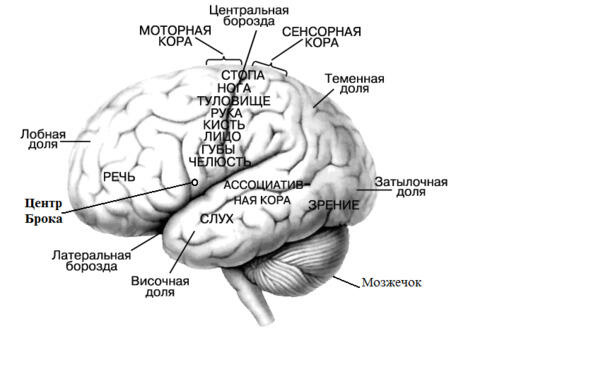 Центральной бороздой мозг делится на передний и задний отдел. Передний отдел преимущественно составляет лобная доля. Теменная, затылочная, височные доли образуют задний отдел головного мозга. В них проецируются раздражения от органов чувств (зрения, слуха, кожной чувствительности, а также от рецепторов, заложенных в органах движения, кинестетический, или двигательный, анализатор). Эту область называют сенсорной (или моторно-сенсорной).