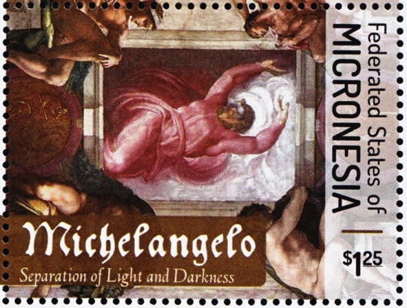 Аддзяленьне сьвятла ад цемры. Мікеланджэла (14751564). Фрагмэнт фрэскі. Сікстынская капэла (15081512). Ватыкан. Марка пошты Мікранезіі, выдадзеная ў 2012 годзе