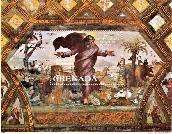 Стварэньне жывёл (151819). Рафаэль Санці (14831520). Фрэска лёджыі Рафаэля. Блёк пошты Грэнады, выдадзены ў 1983 годзе