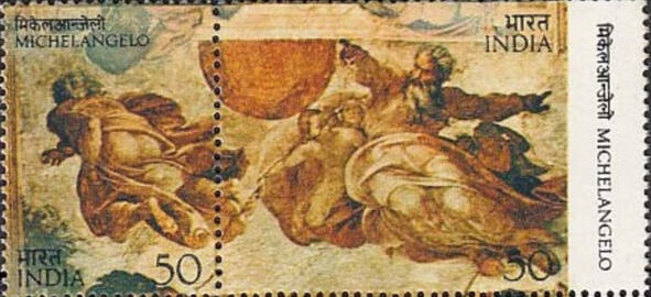 Стварэньне сьвяціл. Мікеланджэла (14751564). Фрагмэнт. Сікстынская капэла (15081512). Ватыкан. Марка пошты Індыі, выдадзеная ў 1975 годзе