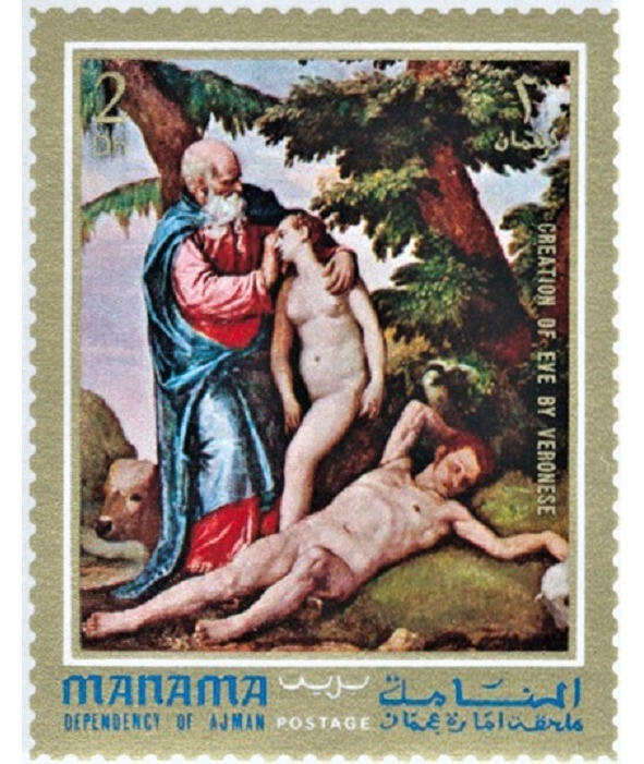 Стварэньне Евы (15751580). Паола Вэранэзе (15281588). Мастацкі інстытут. Чыкага. Марка пошты Манамы, выдадзеная ў 1971 годзе