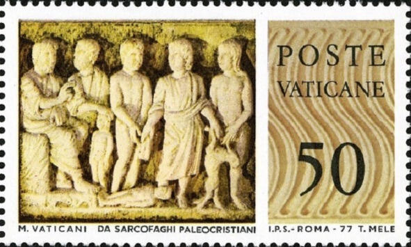 У 1977 годзе пошта Ватыкану выпусьціла сэрыю марак з матывамі барэльефаў са старахрысьціянскіх саркафагаў. На адной з марак паказаны фрагмэнт верхняй левай часткі, дзе знаходзіцца самая раньняя вядомая скульптура Сьвятой Тройцы: Бога Айца, Сына і Духа Сьвятога. Сьвяты Дух стаіць за тронам Бога Айца (на марцы адсутнічае). Бацька кладзе правую руку на плячо Сына, які знаходзіцца ў акце стварэньня Евы. Паводле Біблейскага апавяданьня, Адам ляжыць на зямлі і сьпіць. Першыя хрысьціяне разумелі, што справа стварэньня чалавека была справай Божай любові.
