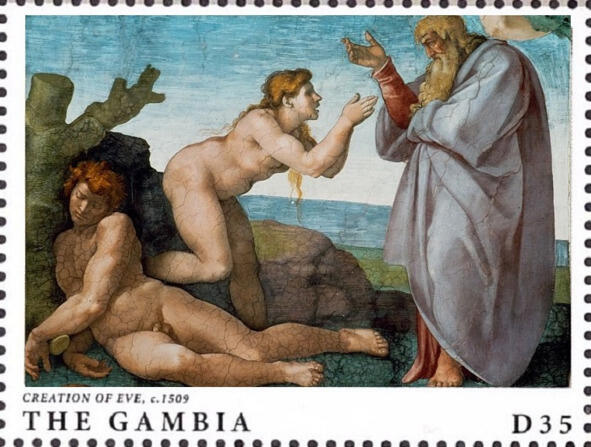 Стварэньне Евы. Мікеланджэла Буанароці (14751564). Сыкстынская капэла, Ватыкан. Марка пошты Гамбіі, выдадзеная ў 2012 годзе
