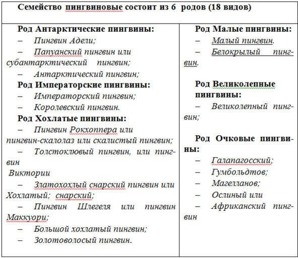 В Южном полушарии нашей планеты обитает 18 видов пингвинов: из них два вида (Императорские и Адели) в Антарктиде, а остальные в Антарктике и в более северных широтах южного полушария (хохлатые, малые, великолепные и очковые). Гнездятся они огромными колониями иногда до нескольких тысяч особей.