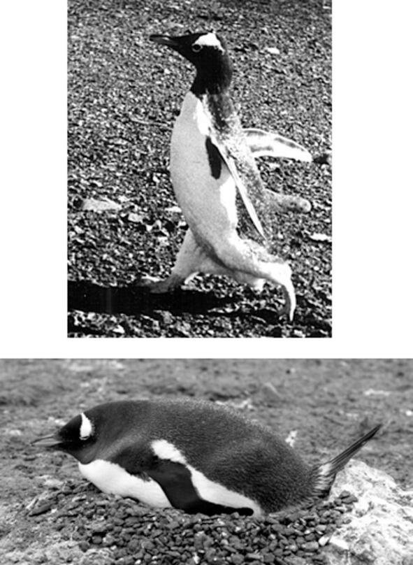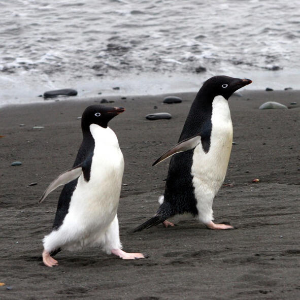 Пингвин Адели птица средних размеров длина туловища около 70 см, вес около 6 кг. Верх тела чёрный, грудь белая. Вокруг глаз белые кольца. Черно-белое оперение пингвинов Адели похоже на строгий черный фрак с белой манишкой.