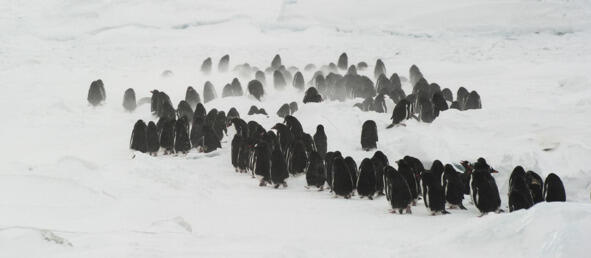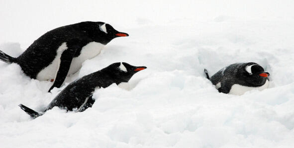 Взобравшись на очередную сопку, пингвины отдыхают, а затем на животе стремительно съезжают вниз по покрытому тонкой ледовой коркой заснеженному склону.