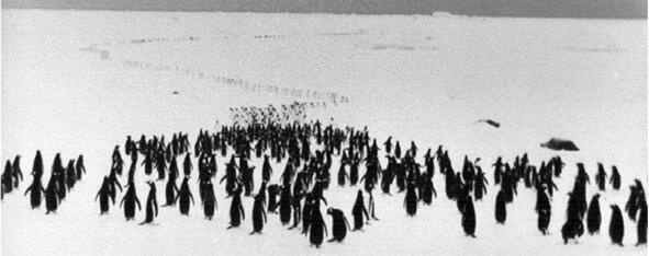Ответ не заставил себя ждать когда мы подошли к восточному берегу полуострова, перед нами открылось фантастическое зрелище: там, вдали у горизонта у открытой воды, по припаю в строну полуострова Ардли, извиваясь черной лентой в несколько километров, в нашу сторону шло несметное число пингвинов Папуа. Цепочка извивалась, видимо, пингвины обходили торосы, останавливались, отдыхали, дожидались отставших, затем снова продолжали движение. Их было несколько тысяч. Те, которые вышли на берег, не разбегались, а спокойно ждали отставших. Мне показалось, что после того как пингвины вступали на берег острова, они поворачивались в сторону приближающихся сородичей, как бы ожидая, когда все племя придет на место будущей колонии.