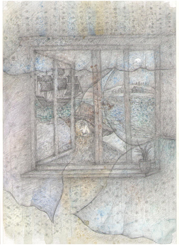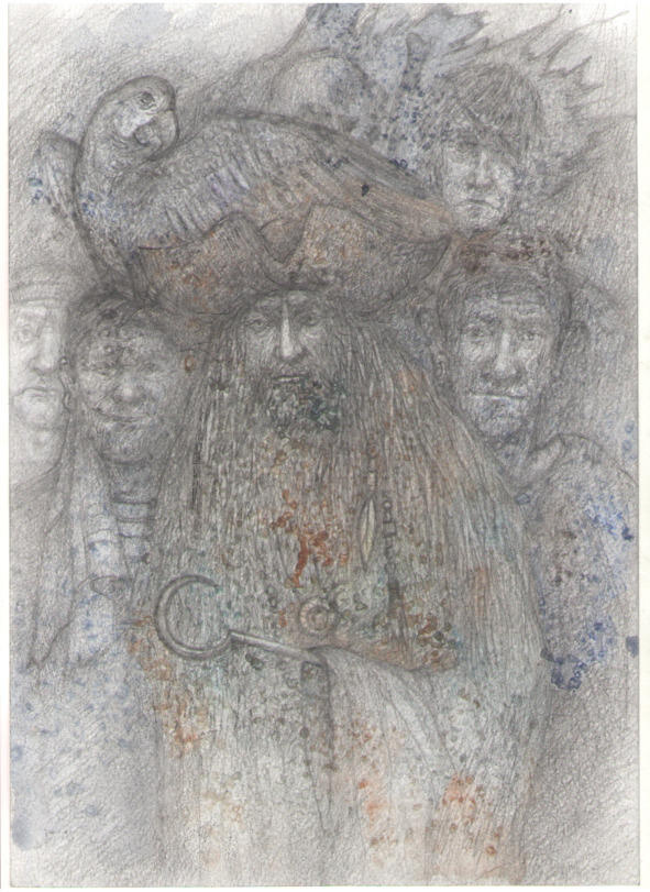 Коля всегда спал с открытым окном. Папа говорил, что это закаляет организм. И в эту ночь окно было открыто. Было светло от сияния огромной луны. Слышался шум моря. Вдруг Коля услышал шорох. Он открыл глаза и увидел на подоконнике фигуру человека маленького роста. Человек двинулся вперед, и луна осветило его лицо. Коля увидел рыжую бороду и черную повязку на одном глазу. Человек приблизился к Коле.