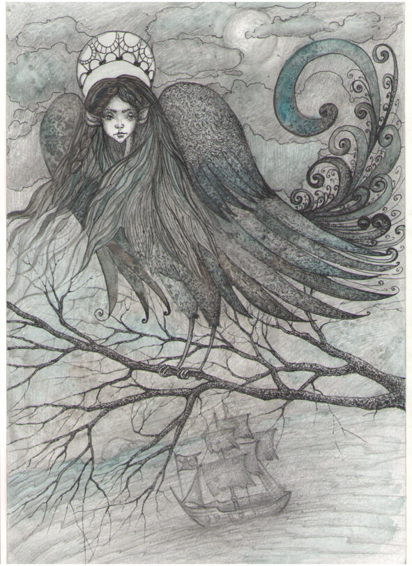Вдруг, когда корабль был уже совсем близко к острову, Коля увидел на деревьях множество птиц. Мальчик присмотрелся и окаменел от ужаса. У птиц были женские головы. Эти головы пели. Коля крикнул: «Назад! Там чудовища с женскими головами!»
