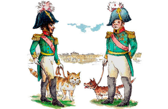 А как-то решил Пушкин себя царем нарядить, а Кошкина собачкой. Так и вышли они на Невский прогуляться, все равно как дамы обычно с собачками гуляют. А народ-то им тут прямо в ноги падает дамы и господа поклонами да реверансами просто так и заваливают. Не каждый ведь день увидишь, как царь с собачкой прогуливается. Гуляли себе гуляли хотели уж назад, домой поворачивать, а тут навстречу вдруг настоящий царь с настоящей собачкой выступает. Ну и потеха! И бывает же такое!