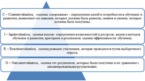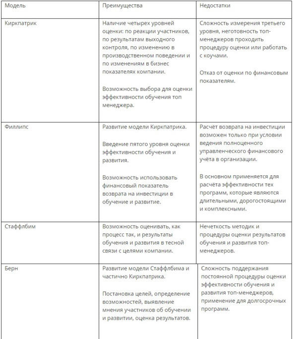 Модель позволяет оценить как результаты, так и сам процесс обучения и развития. Поэтому для длительных модульных программ обучения топ-менеджеров данная модель может быть успешно применена.