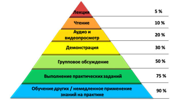 Дальше его последователи разработали новую графическую версию влияния методов обучения на степень усвоения материала, которую назвали «Пирамида обучения». Ее ты можешь видеть на картинке.