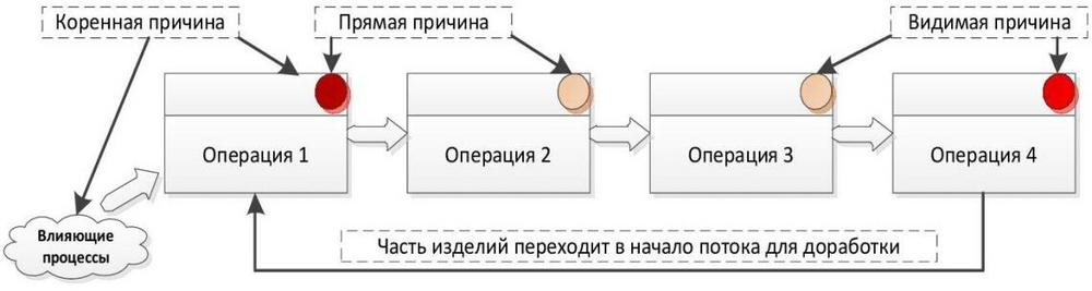 На рисунке (см. выше) схематично показаны возможные места расположения видимой, прямой и коренной причин возникновения дефектов. Обратите внимание, что коренные причины могут находиться в любых процессах, влияющих на основной процесс или операцию, а не обязательно в месте возникновения дефекта. Также и видимая причина не всегда может находиться в месте выявления дефекта.