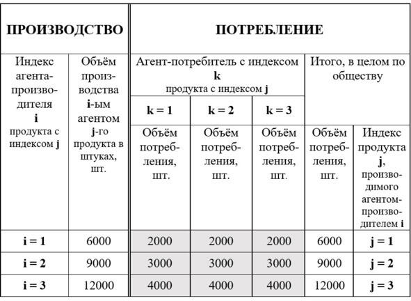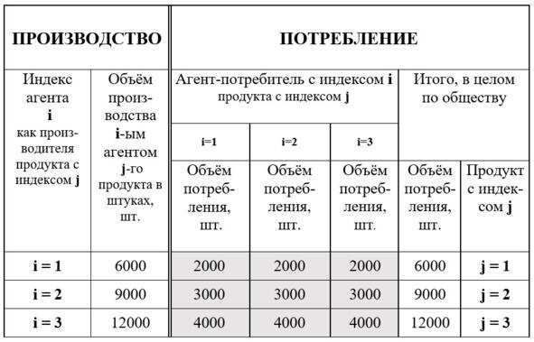 Здесь, судя по зеркальному отображение двойных индексов, каждый из агентов выступает одновременно и как агент (первый индекс двойной индексации i), отчуждающий свой продукт, и как агент (второй индекс двойной индексации k), приобретающий для своего потребления продукт другого вида «взамен» отчуждённого продукта. В результате такого взаимодействия осуществляется метаболический «обменный» процесс, который в буржуазном обществе, в случае, если типологии обеих продуктов «внешний предмет, вещь», принято именовать «товарообменом». Ячейки матрицы с элементами этих пар, дополнительно к двухсторонним стрелкам, выделены тонировкой различной интенсивности, одинаковой для каждой пары.