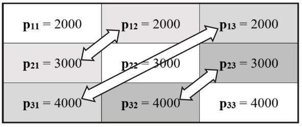 Для устранения этого казуса сохраним за первым индексом «i» первоначальное обозначение агента-производителя (строка), введя вместо обозначения второго индекса через «i» (столбец агента-потребителя) новое обозначение через «k». При этом сохраним индекс «j» для обозначения вида продукта. Тогда количество продукта в каждой ячейке матрицы, выделенной на рисунке 8 серым тонированием, будет иметь двойное индексирование с парой индексов «i» и «k», а сам элемент с количеством продукта в штуках будет обозначаться как pik (i = 1, 2, , m; k = 1, 2, , n). В данном примере максимальные значения индексов «i», «k» и «j» равны, соответственно, m = 3, n = 3 и q = 3.
